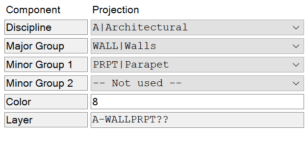 Wie im Abschnitt Definieren von Layer Standards beschrieben, wird der Layername in Komponenten zerlegt. In diesem Beispiel wird der weit verbreitete Standard “AIA” verwendet. Die Komponenten werden aus Listen ausgewählt. In diesem Fall sind die Werte für “Minor Group” als “Kontextlisten” definiert. Das bedeutet, dass die Liste der Werte vom Inhalt der vorhergehenden Komponente “Major Group”, abhängig ist. Es zeigt auch, dass einige Komponenten für bestimmte Kategorien fehlen können.