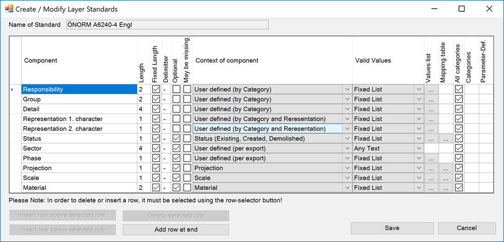 The picture below shows the dialog to define and modify layer standards with a pretty comprehensive standard that had been developed in Austria.